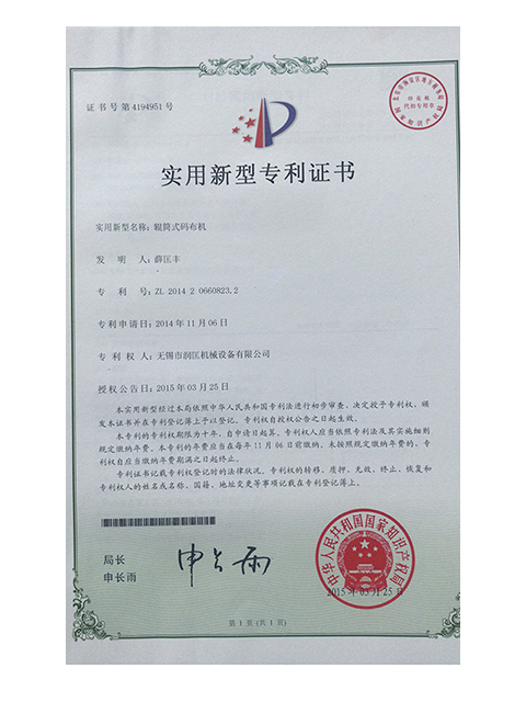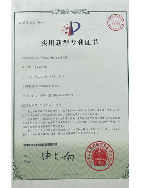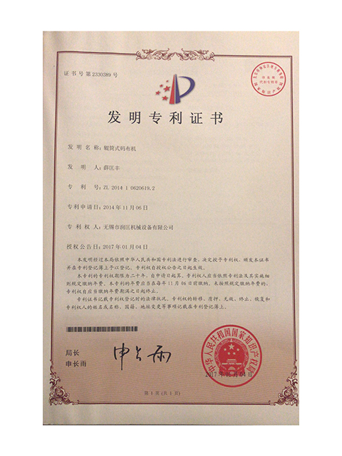公司獲得滾筒式碼布機(jī)發(fā)明專利證書